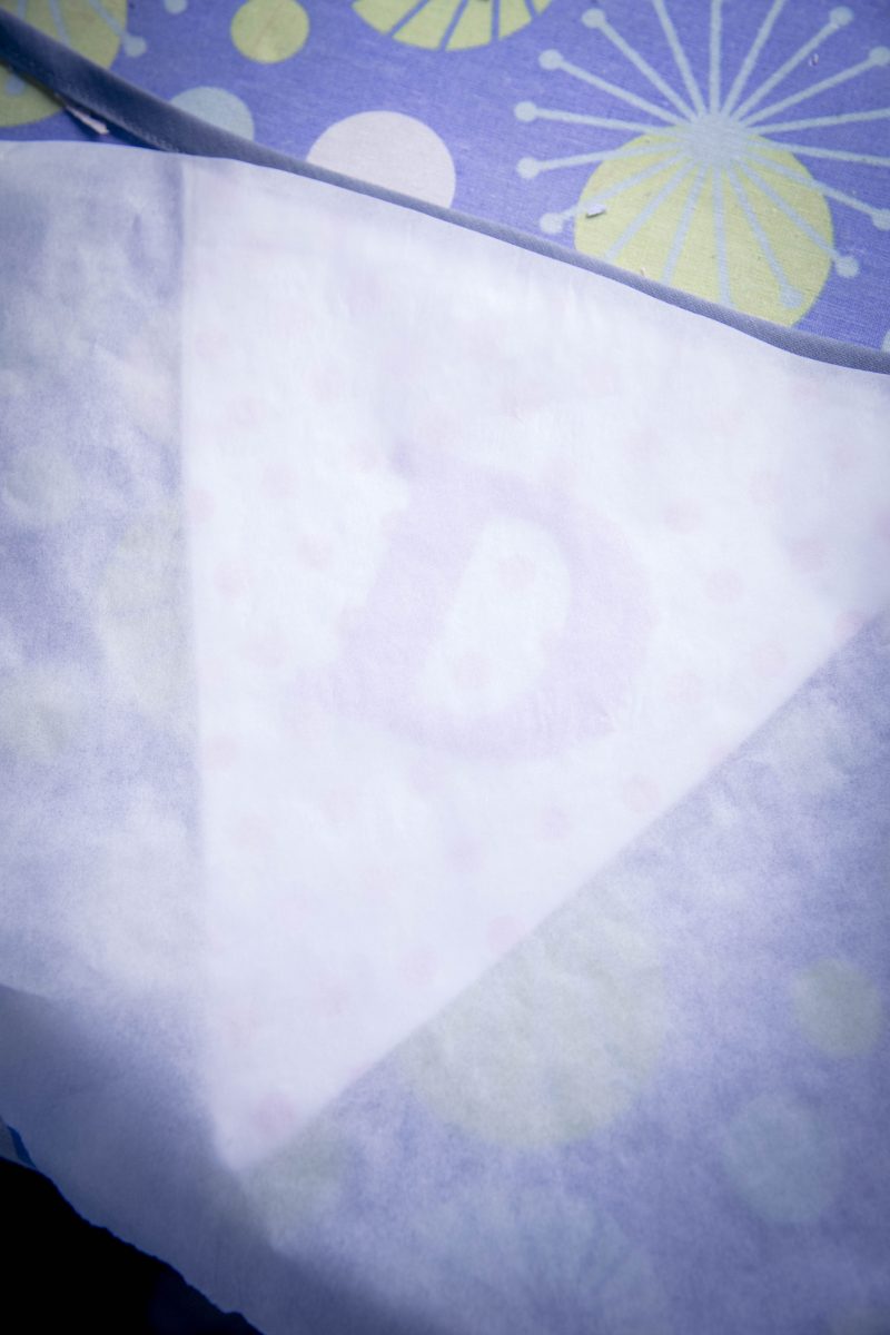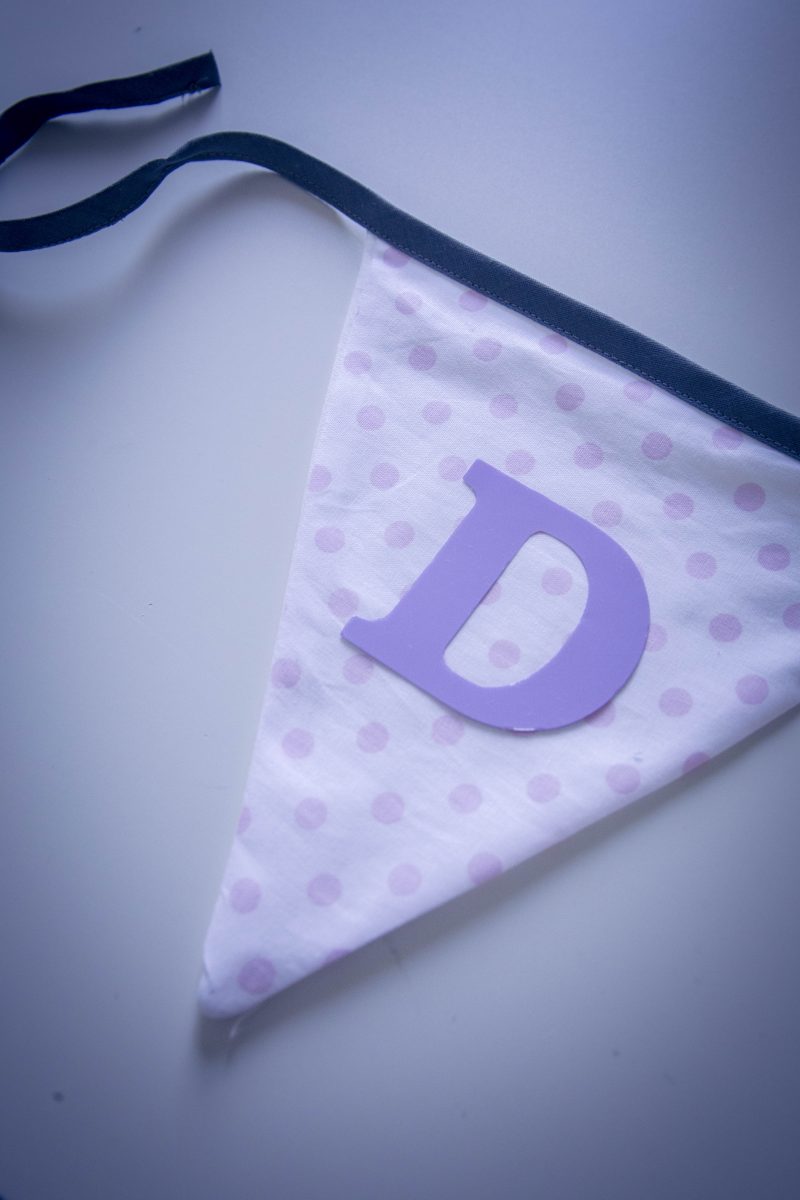 - et un objet à personnaliser (j’ai choisi une guirlande fanion que j’avais réalisée à l’avance, si vous aimez le tissu vous pouvez le trouver ici ).