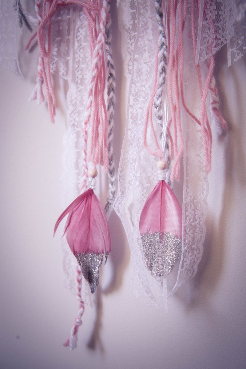 Un doux mélange de rose poudré, de blanc, de paillettes, de laine, de rubans et de décorations sur le thème de la couture… Elle a confectionné pour moi un attrape-rêve réalisé avec une multitude de détails très minutieux…