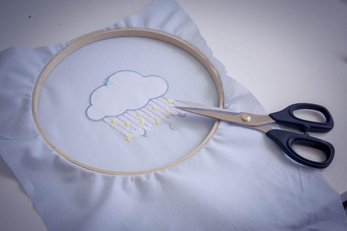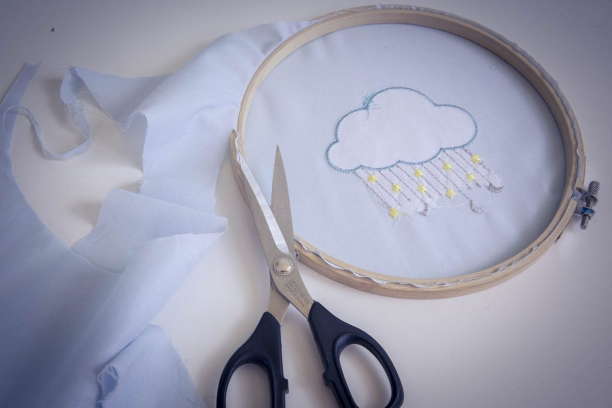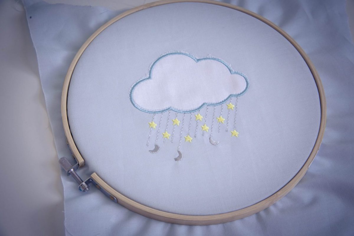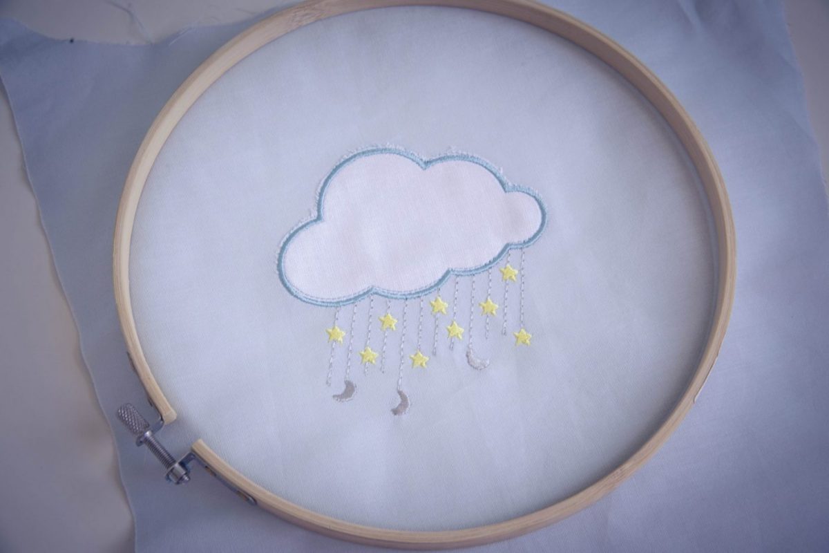 Pour ce tutoriel j’ai choisi d’utiliser un motif de broderie « nuage étoilé » de chez Alice broderie. Dans un premier temps, j’ai réalisé le motif de broderie avec ma machine à broder en utilisant la technique de l’appliqué (si vous voulez plus d’explications sur cette technique un tuto est ici).