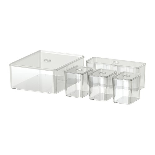 Et encore quelques boites de chez Ikéa vendues pour les salles de bain (à moins de 10€ le lot de 5 boites). Je les aime pour leurs côtés transparents, hyper pratique pour visualiser leur contenu.