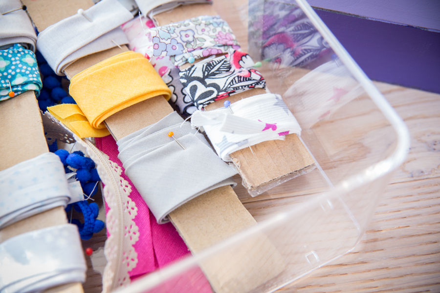 J’y ai rangé mes pinces de couture, les biais faits maison, des craies et mes boucles d’attache-tétine… Et en plus elles ont un couvercle pour éviter la poussière !